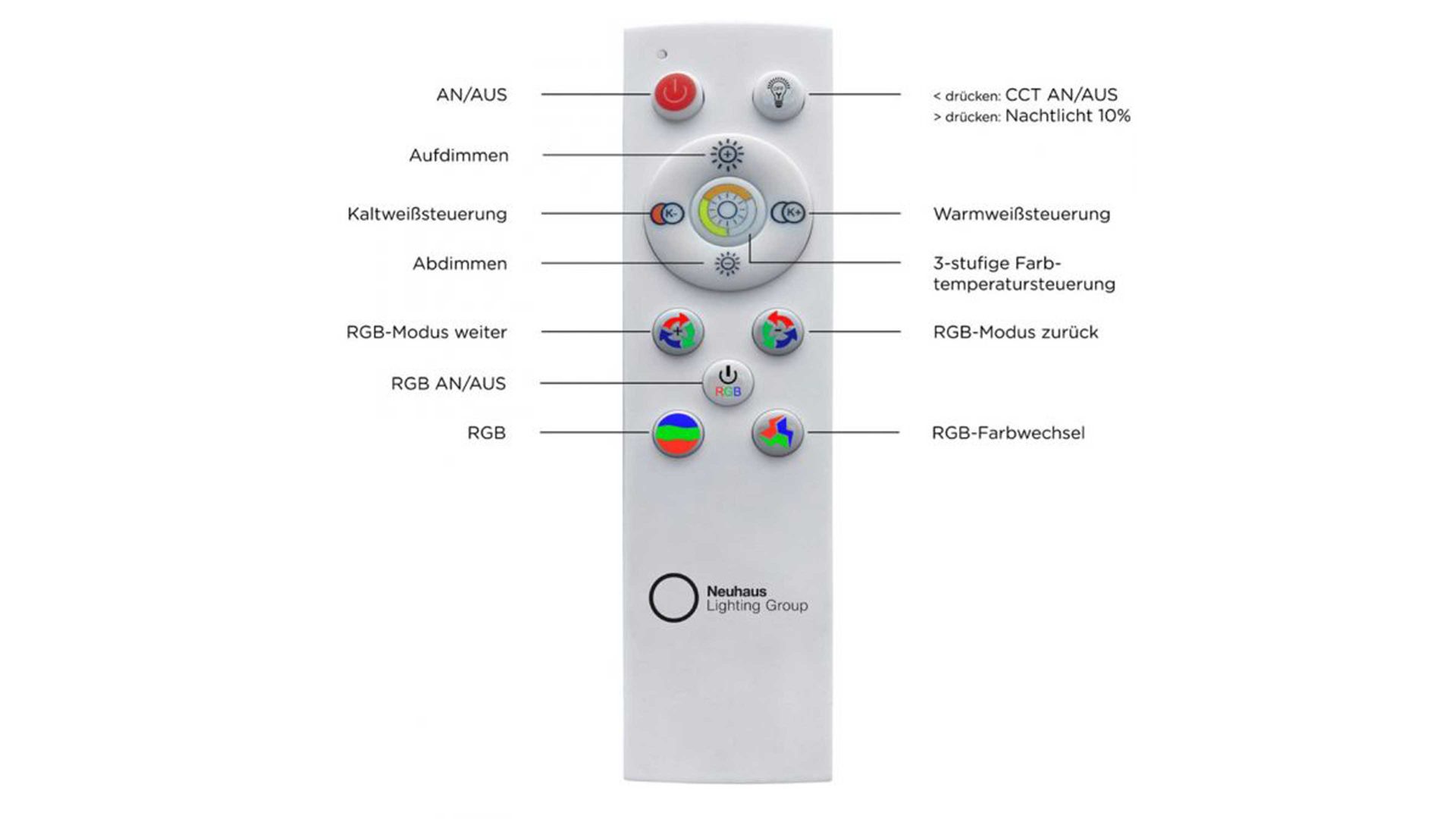 | Verstellbarkeit und Funktion: | dimmbar Fernbedienung Memoryfunktion CCT | Lichtmanagement Farbwechselfunktion | |