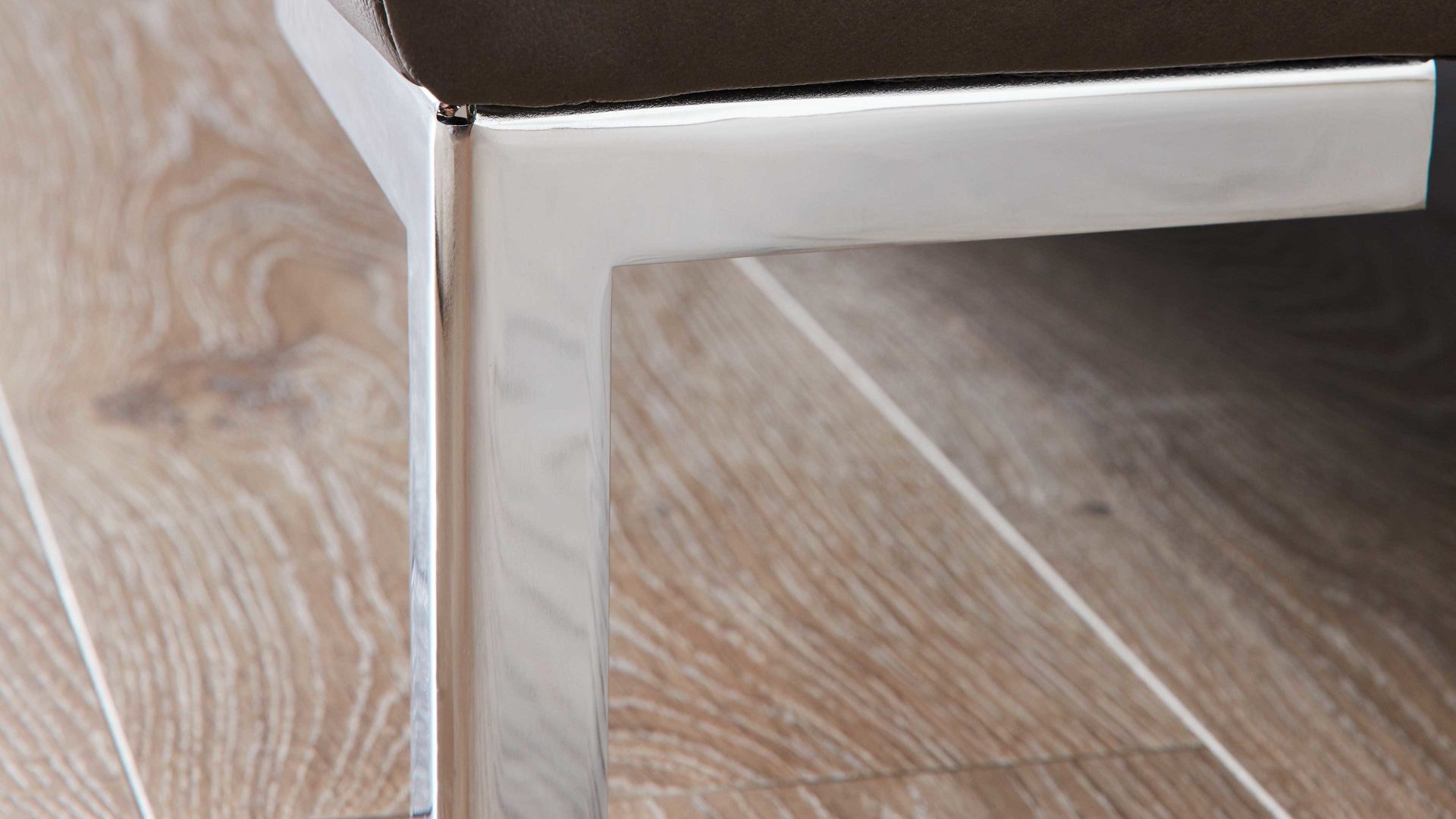 Der XXL-Hocker überzeugt nicht nur durch Funktion, sondern auch durch sein edles Erscheinungsbild. Der dunkelgraue Lederbezug mit weißer Kontrastnaht verleiht ihm eine moderne, elegante Note, während die silberglänzenden Metallfüße für Leichtigkeit und Stabilität sorgen. Die bodenfreie Gestaltung wirkt nicht nur luftig, sondern ist auch praktisch – perfekt für Saugroboter und eine einfache Reinigung.