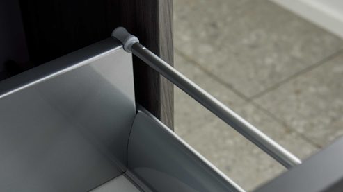 Der Hängeschrank bietet eine Metallschublade und einen zusätzlichen Metallauszug – beide mit Premium-Dämpfungstechnik ausgestattet, damit sie besonders sanft und leise schließen. Die Ablageplatte in grauer Cuneo Eiche-Nachbildung setzt einen edlen Akzent und bietet zugleich eine praktische zusätzliche Ablagefläche für Pflegeprodukte oder Deko.