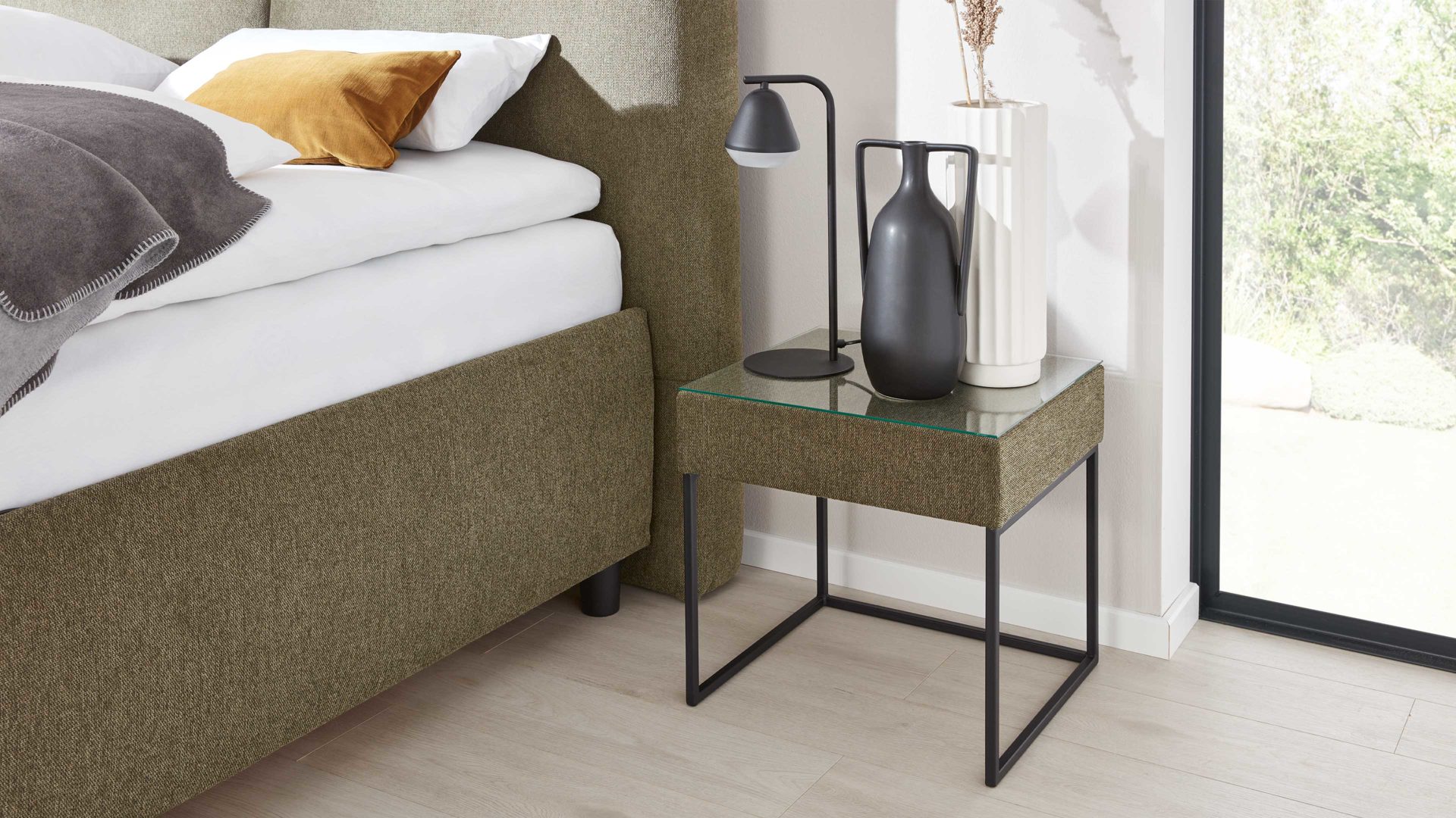 Die Nachtkonsole aus der Interliving Bettsystem Serie 1414 vereint moderne Eleganz, funktionale Gestaltung und hochwertige Materialien. Der olivgrüne Stoffbezug bringt warme, natürliche Akzente in Ihr Schlafzimmer, während die mattschwarzen Metallkufen für einen spannenden Kontrast sorgen. Das Ergebnis ist eine Nachtkonsole mit schwebender, leichter Optik, die sich perfekt in moderne Wohnkonzepte einfügt.