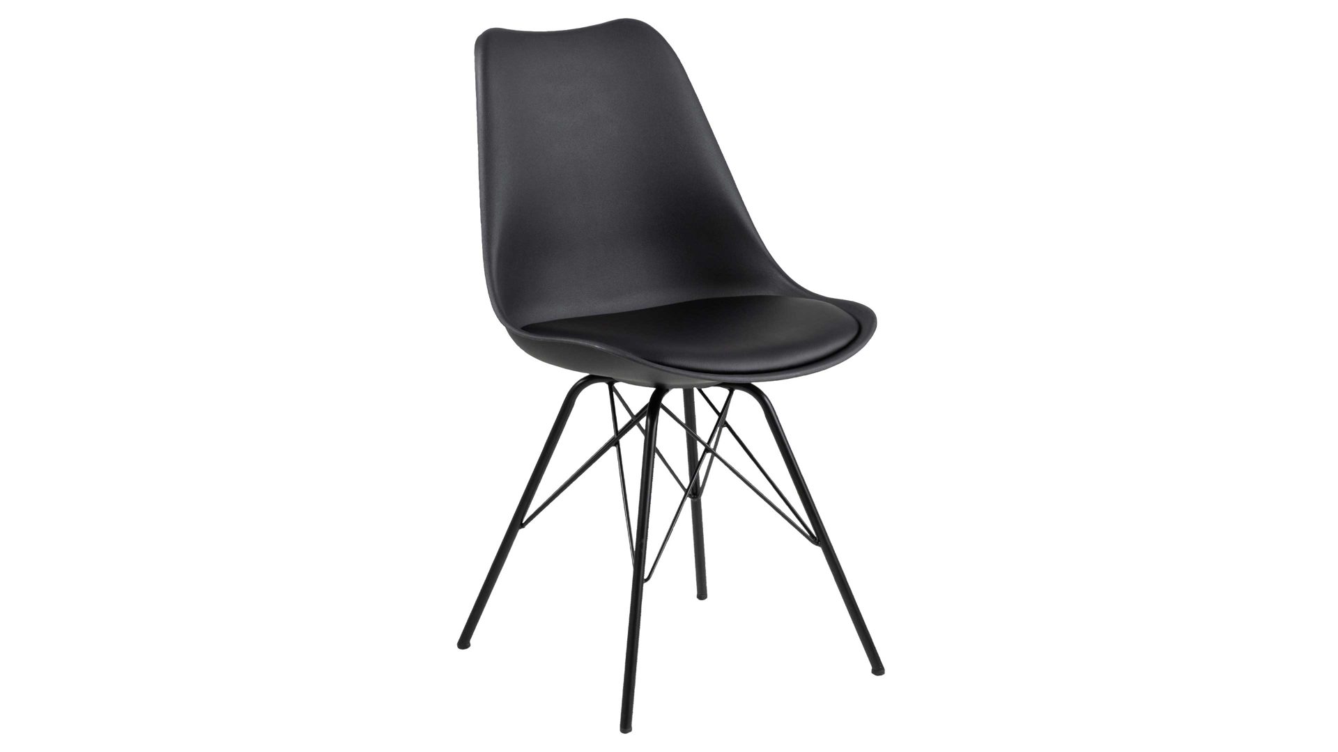 Dieser Polsterstuhl verkörpert puristische Eleganz. Als stabile, dabei aber wunderbar filigran designte Basis fungiert ein verchromtes Stahldrahtgestell. Darauf befindet sich eine schwarze Sitzschale aus robustem Kunststoff. Sie ist rundherum mit schwarzem Kunstleder bezogen, das sowohl qualitativ als auch optisch und haptisch überzeugt. Die Farbgebung sorgt für eine klassisch-schlichte Ausstrahlung.