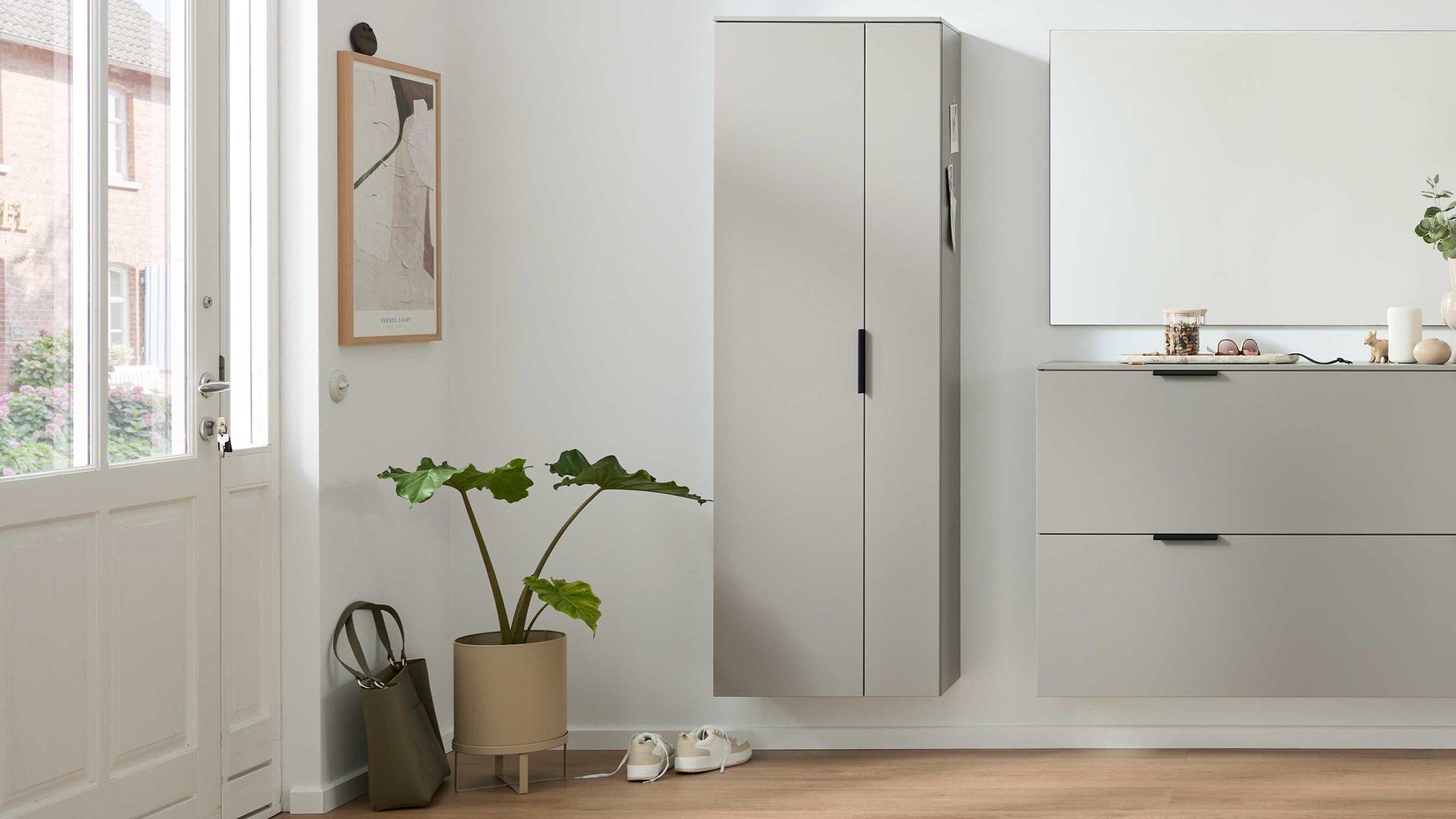 Die wandhängende Montage macht den Schrank zum eleganten Statement im Eingangsbereich und sorgt für eine moderne, schwebende Optik – ideal für puristische Wohnkonzepte und minimalistische Flurmöbel.