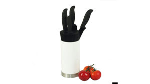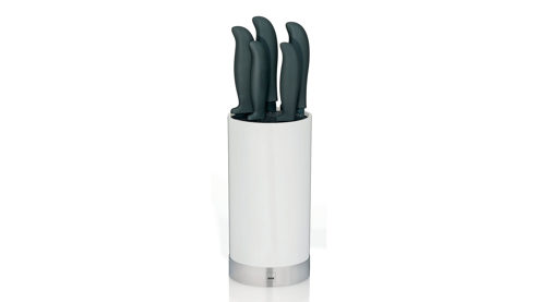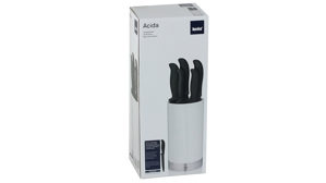 Praktisch und stilvoll zugleich: der Messerblock Acida von kela. Dieser beinhaltet fünf verschiedene qualitativ hochwertige Messer, von klein bis groß, die aus Edelstahl gefertigt sind. Der Messerblock ist aus weißem PP-Kunststoff gefertigt. Dieser hat zudem ein praktisches Innenleben, das einfach herausnehmbar ist. Die Messer sind durch dünne Kunststoff-Streifen im Messerblock voneinander getrennt und können somit nicht so leicht verkratzen. Maße ca. 11 x 23 cm (DxH) mit 1 x Chefmesser ca. 32 cm (L), 1 x Fleischmesser ca. 32 cm (L), 1 x Brotmesser ca. 32 cm (L), 1 x Ausbeinmesser ca. 24 cm (L), 1 x Küchenmesser ca. 20 cm (L)