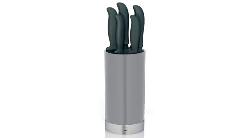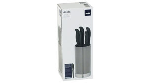 Praktisch und stilvoll zugleich: der Messerblock Acida von kela. Dieser beinhaltet fünf verschiedene qualitativ hochwertige Messer, von klein bis groß, die aus Edelstahl gefertigt sind. Der Messerblock ist aus grauem PP-Kunststoff gefertigt. Dieser hat zudem ein praktisches Innenleben, das einfach herausnehmbar ist. Die Messer sind durch dünne Kunststoff-Streifen im Messerblock voneinander getrennt und können somit nicht so leicht verkratzen. Maße ca. 11 x 23 cm (DxH) mit 1 x Chefmesser ca. 32 cm (L), 1 x Fleischmesser ca. 32 cm (L), 1 x Brotmesser ca. 32 cm (L), 1 x Ausbeinmesser ca. 24 cm (L), 1 x Küchenmesser ca. 20 cm (L)