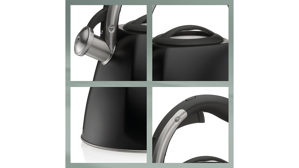 Schwarzer Wasserkessel mit Pfiff: der Wasserkessel Vitus aus 18/10 Edelstahl. Durch die große Grundfläche eignet er sich zum schnellen und energiesparenden Wasserkochen. Kocht das Wasser, ertönt ein Pfeifton. Er ist zudem gut zu handhaben, da der Klappmechanismus zum Öffnen des Deckels in den Griff integriert ist. Der Wasserkessel ist für alle Herdarten geeignet, auch für den Induktionsherd. Der Wasserkessel hat einen Durchmesser von ca. 22 cm. Volumen 2,4 Liter. Farbe: Schwarz matt