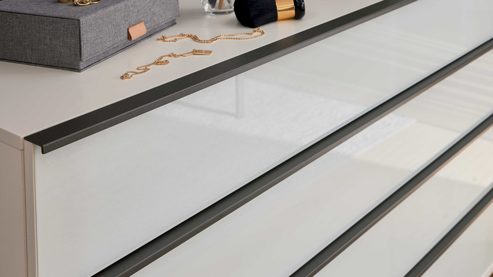 Abgerundet wird das Komplettzimmer durch die Schubladenkommode (Typ B20089) mit mattweißem Korpus, weißen Glasfronten und schieferfarbenen Griffleisten und Maßen von ca. 149 × 82 × 42 cm (B/LxHxT), ausgestattet mit Vollauszug und Softclose-Funktion. Die Kommode wird fertig montiert geliefert.