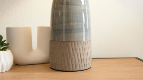 Der beige Stoffschirm sorgt für weich gestreutes Licht und wird von einem stabilen weißen Metallgestell getragen. Der Lampenfuß aus Keramik zeigt einen Farbverlauf in Grau, Blau und Taupe – mit spannender Mischung aus glänzenden, matten und rauen Oberflächen. So wird jede Wohnraumleuchte zu einem echten Unikat mit individuellem Charakter.