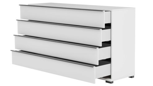 Abgerundet wird das Komplettzimmer durch die Schubladenkommode (Typ B20089) mit mattweißem Korpus, weißen Glasfronten und schieferfarbenen Griffleisten und Maßen von ca. 149 × 82 × 42 cm (B/LxHxT), ausgestattet mit Vollauszug und Softclose-Funktion. Die Kommode wird fertig montiert geliefert.