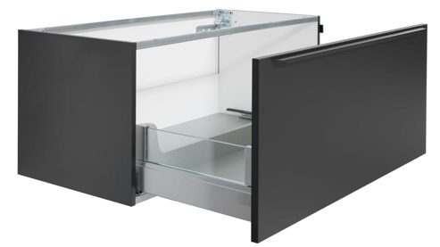 Der Waschtischunterschrank (Typ 2488) überzeugt mit supermatter schwarzer Lacklaminatfront, schwarzem Relinggriff (Typ 7945) und mattschwarzem Korpus. Ein großer Auszug mit Rückwand sorgt für Ordnung, für noch mehr Komfort ist die große Schublade mit Softclose und Selbsteinzug ausgestattet. Praktische Handtuchhalter kannst du gegen Mehrpreis ergänzen.