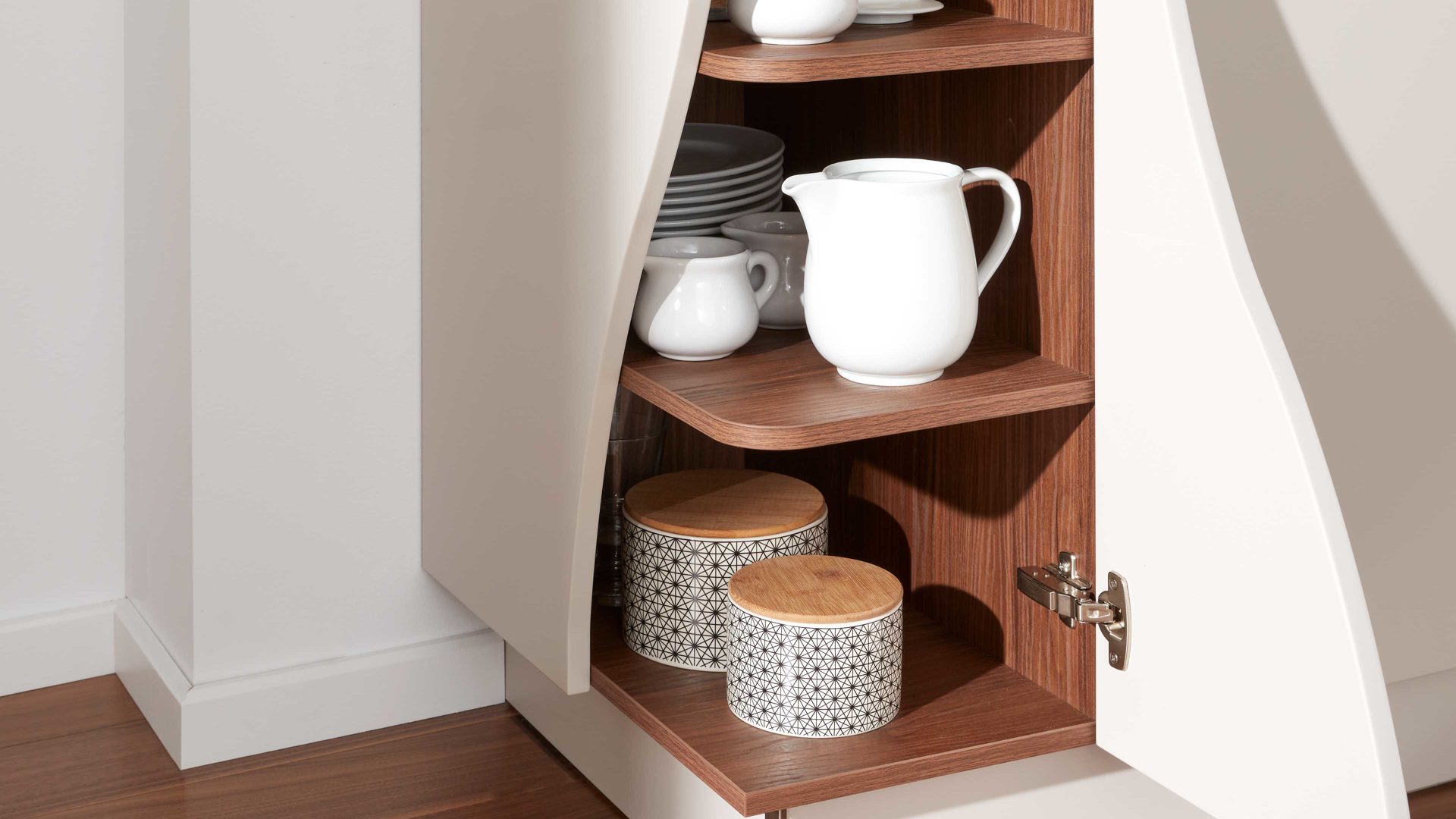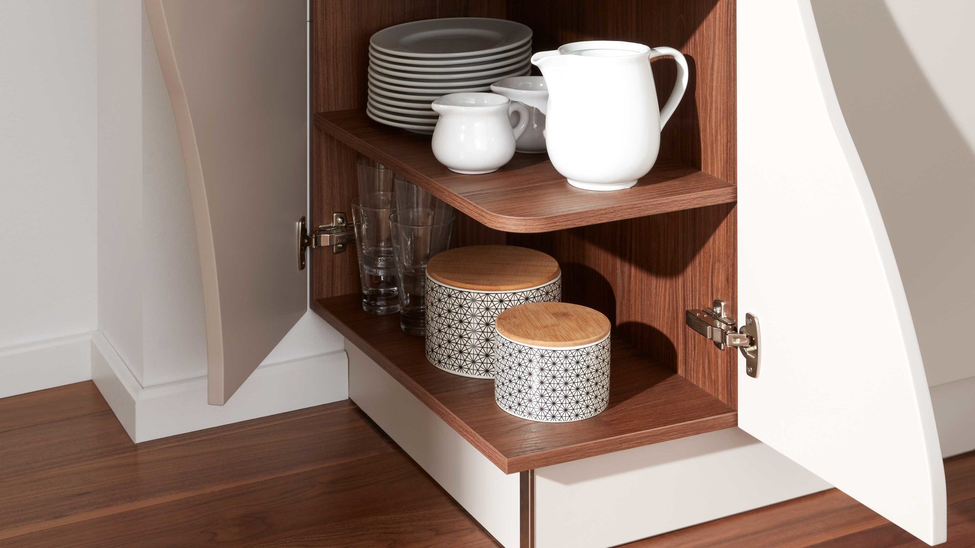 Die Interliving Küche Serie 3005 verbindet zeitlose Eleganz mit praktischer Funktionalität. Ihre hochwertigen saharafarbenen Softlack-Fronten bringen eine warme, einladende Ausstrahlung in den Raum. Im Zusammenspiel mit den nussbaumfarbenen Arbeitsplatten entsteht ein edles Farbkonzept, das sofort ins Auge fällt. Besonders raffiniert wirken die halboffenen Schrankelemente mit geschwungenen Türen am linken Rand – sie setzen ein unverwechselbares Highlight und verleihen der Küche einen individuellen Charakter.