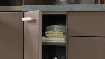 Die Interliving Küche Serie 3064 beeindruckt mit ihrer besonderen Farbkombination aus matten sepiabraunen Lackfronten und graphitgrauen Korpussen. Für spannende Kontraste sorgen die Arbeitsplatten und Nischenverkleidung in lavagrauer Sandstein-Nachbildung, die dem Gesamtbild eine edle Note verleihen. Metallgriffe runden das moderne Design stilvoll ab und setzen dezente Highlights.