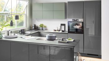 Die nobilia® Einbauküche Flash kombiniert die eindrucksvolle Eleganz von hochglänzendem Schiefergrau mit Akzenten in mattem Schilf.