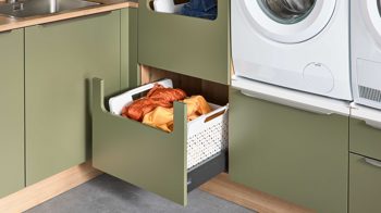 Die Interliving Küche Serie 3074 zeigt, dass auch ein Hauswirtschaftsraum mehr sein kann als nur Stauraum. Mit ihren softmatten olivgrünen Fronten strahlt sie Wärme und Natürlichkeit aus, während die authentische Vulkaneiche-Nachbildung an Sockelblenden, Regalen und Nischenverkleidung für wohnlichen Charakter sorgt. Dezente Metallgriffe runden das harmonische Gesamtbild im beliebten Natural-Living-Stil stilvoll ab.