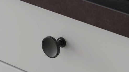 Die nobilia® Einbauküche Softline überzeugt in Seidengrau Perfect matt und setzt auf eine ruhige, elegante Farbwirkung. Schwarze Metallknöpfe verleihen der Küche eine feine, grafische Struktur und unterstreichen die moderne Linienführung.