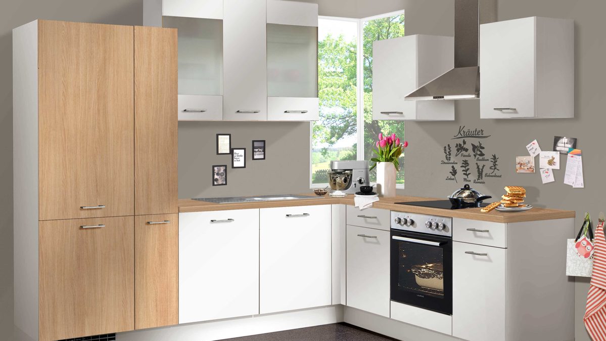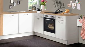 Magnolienweiß und Eiche Aviva-Nachbildung, kombiniert mit edelstahlfarbenen Metallgriffen und Arbeitsplatten in Eiche Aviva-Nachbildung