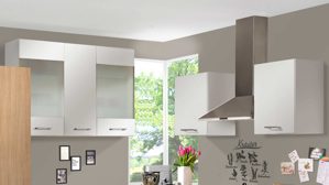 mit hochwertiger Edelstahl-Einbauspüle und Hängeschrank mit Glaseinsätzen