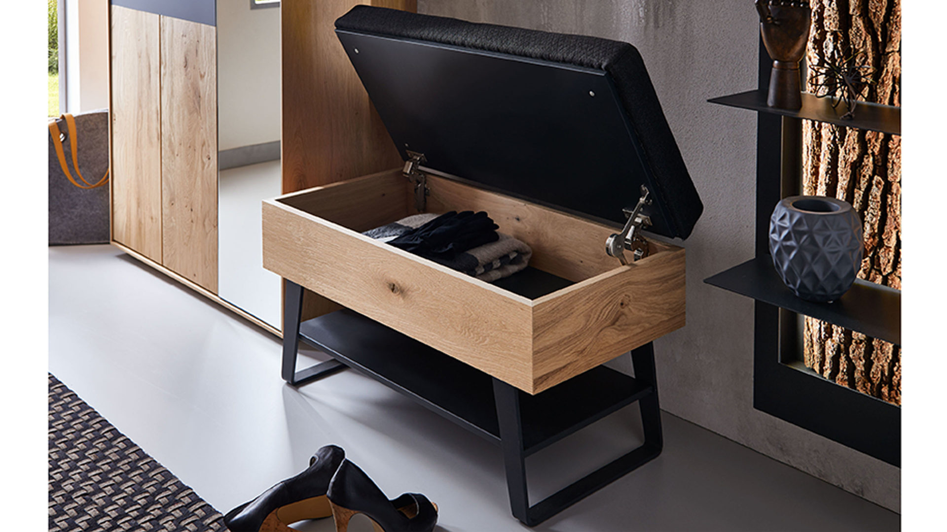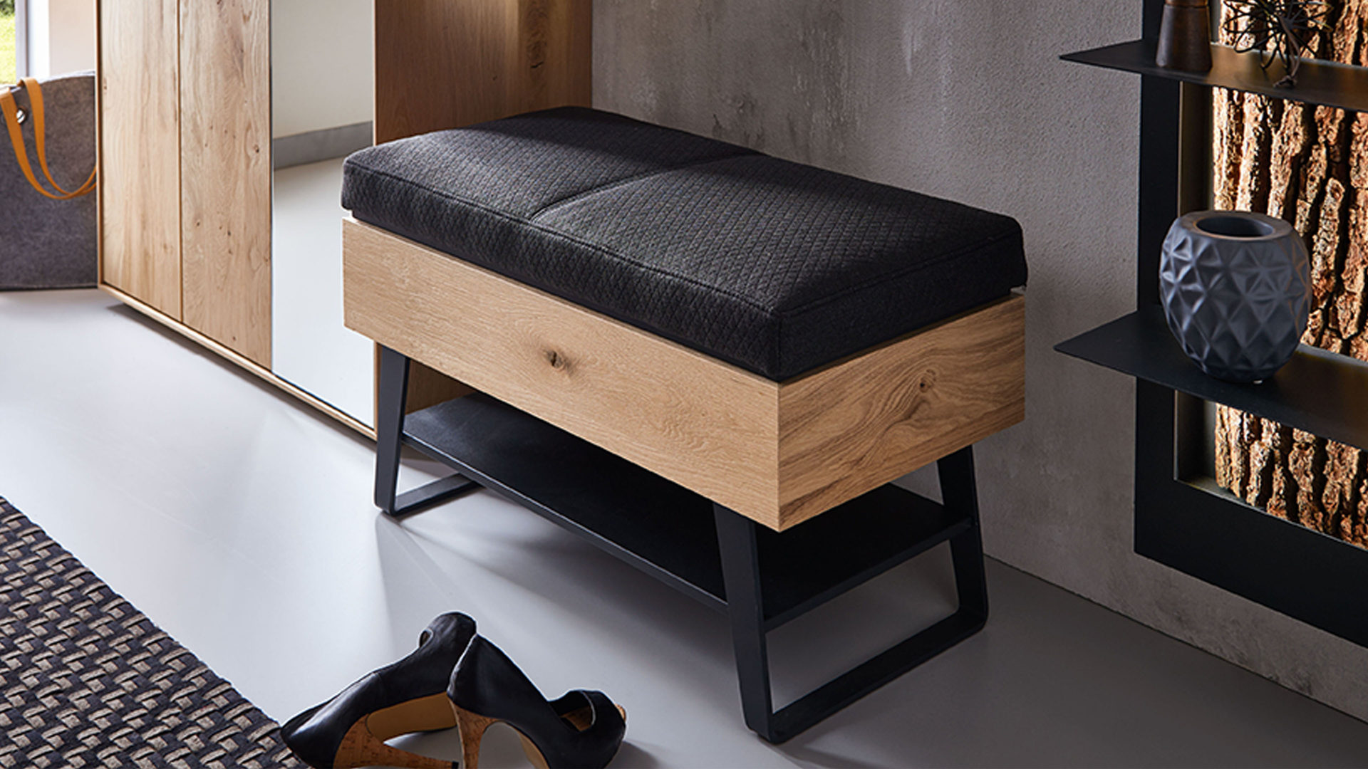 Die Garderobenbank Runa verbindet massive Kerneiche sowie anthrazitfarbenes Metall und einen ebenfalls anthrazitfarben gestalteten Stoff zu einem robusten, modernen und eindrucksvollen Ganzen.