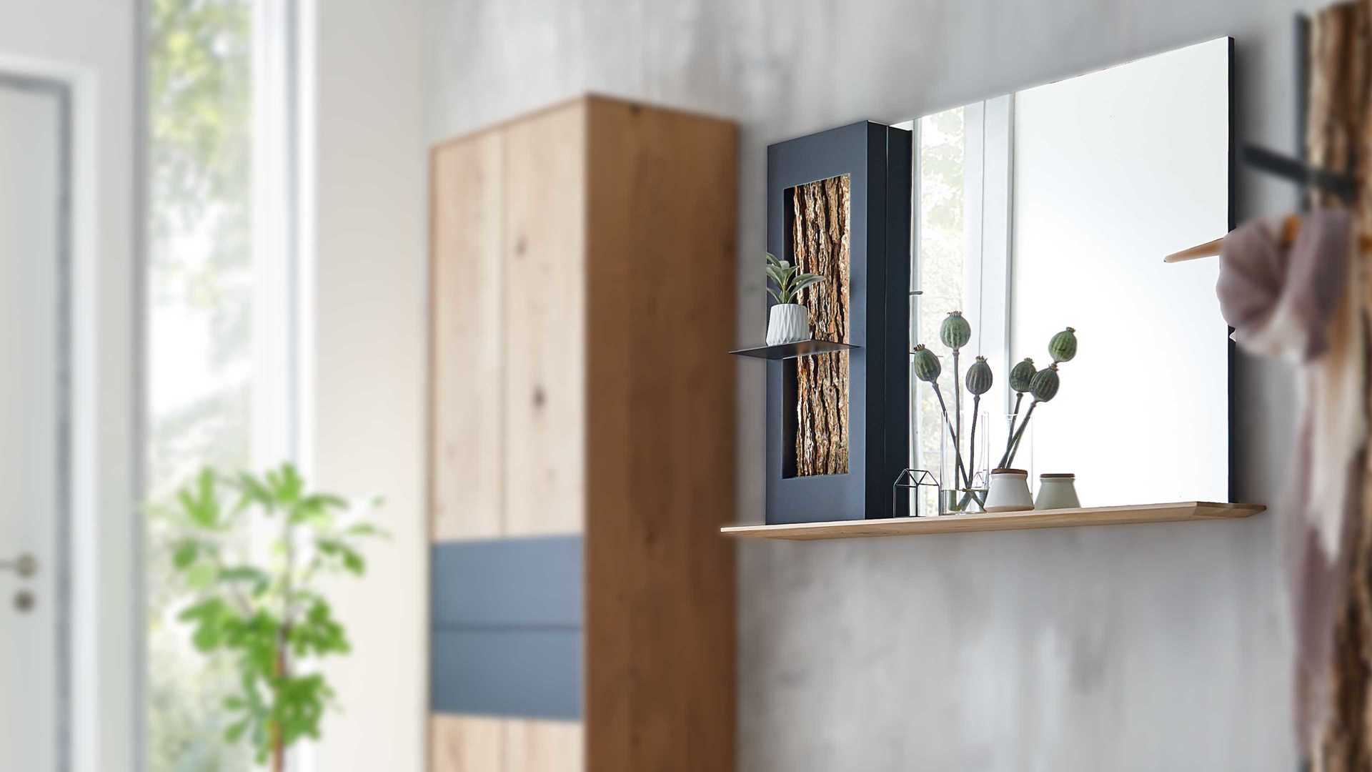 Die Rindenholz-Applikation links, der Spiegel rechts und die metallenen Details wirken kontrastierend, fügen sich aber dennoch harmonisch ins Gesamtbild ein. Das Garderobenregal bietet einen Holzboden und einen kleinen Metallboden. Auf den beiden Ablagen können Sie beispielsweise dekorative Elemente platzieren. Die Maße des speziellen, absolut faszinierenden Spiegel-Regals betragen ca. 118 x 79 x 37 cm (BxHxT). Ergänzend steht gegen Mehrpreis eine akzentuierende LED-Beleuchtung zur Verfügung.