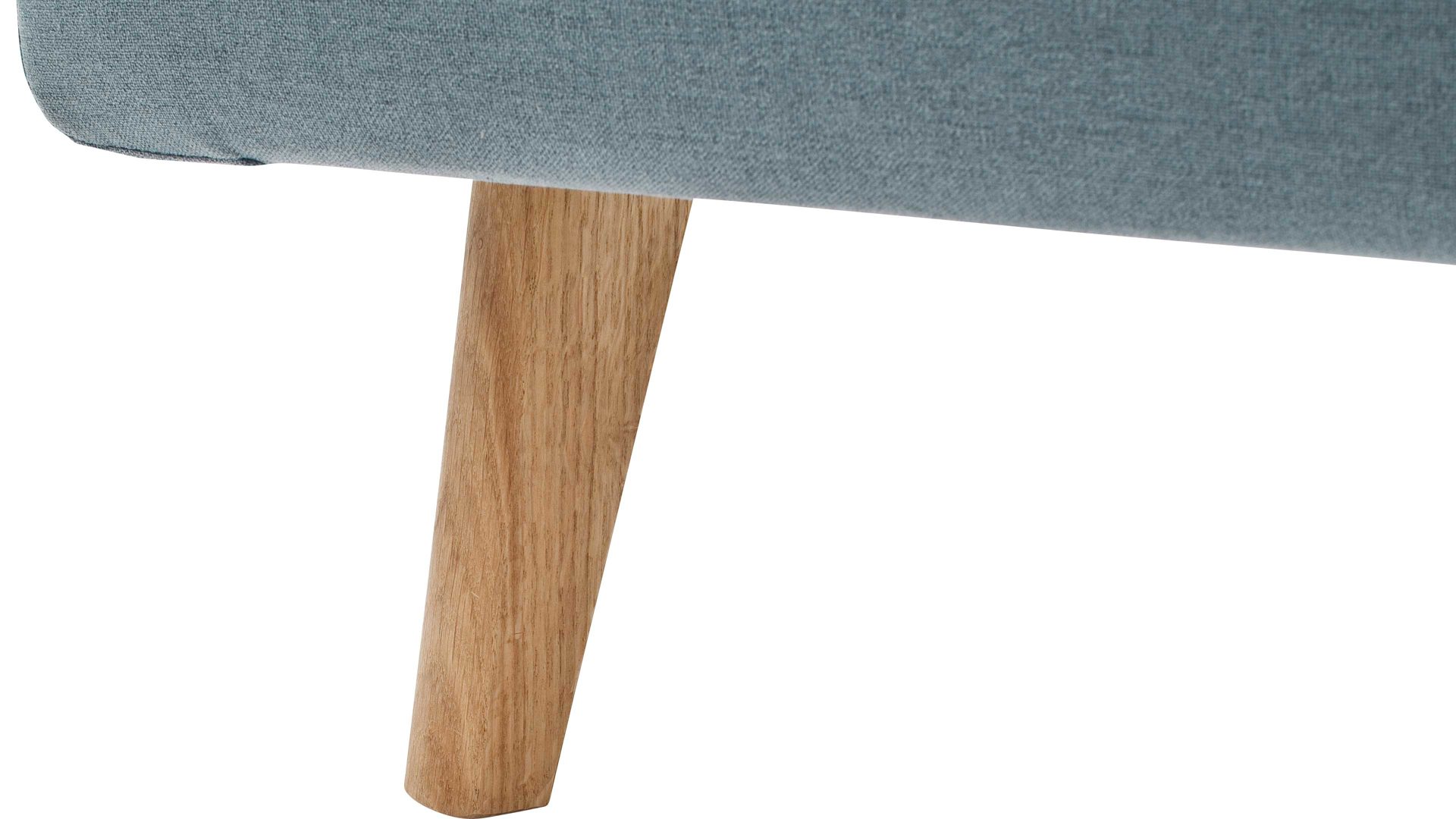 Die warme Farbe der Füße kontrastiert mit dem frischen Ton des Bezugs - und doch harmonieren die beiden Nuancen hervorragend und verführen zu Traumreisen - beziehungsweise Reiseträumen - ans Meer und einen herrlich warmen Sandstrand. Ein weiteres Highlight des rundum überzeugenden Bettgestells bildet das glatt bezogene Polsterkopfteil. Dieses ermöglicht durch die weiche Haptik auch entspannt angelehntes Sitzen, etwa abends beim Lesen vor dem Schlafen oder morgens beim Blick aus dem Fenster zum Wachwerden.