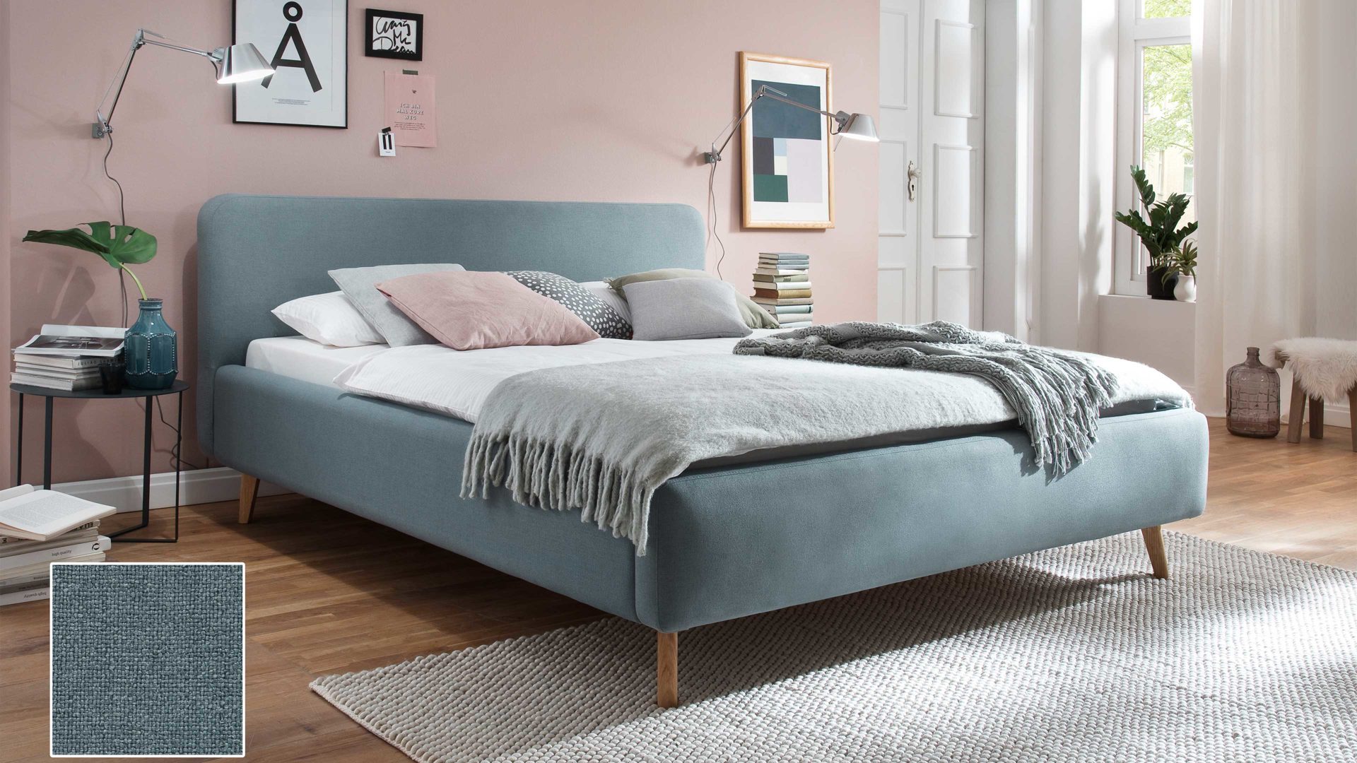 Mit den eichefarbenen Holzfüßen und dem eisblauen Flachgewebebezug bringt das Polsterbettgestell Mattis maritimes Flair in Ihr Schlafzimmer.