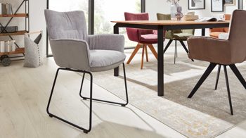 Die Tische sind in zwei Größen erhältlich – wahlweise mit Tischplatte in Massivholz oder Glaskeramik. Passend dazu umfasst die Serie Stühle mit und ohne Funktion, in drei Gestellvarianten und sechs Bezugskombinationen. So lässt sich dein Essbereich ganz nach deinem Geschmack gestalten.