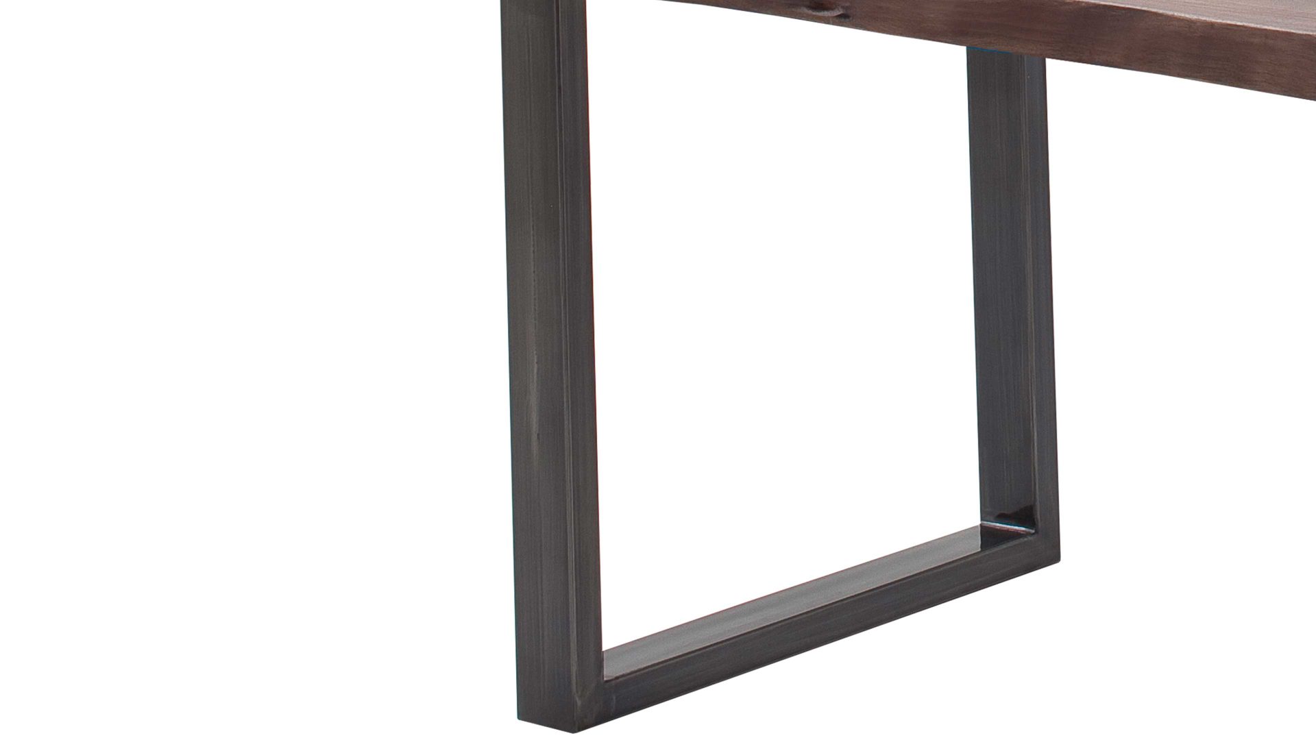 Dieser Esstisch beeindruckt in erster Linie mit seinem außergewöhnlichen Look und der exzellenten Material- und Verarbeitungsqualität. Er kombiniert eine Tischplatte aus walnussfarben lackiertem, zu 100 % FSC(R)-zertifizierten Akazienholz mit einem markanten U-Gestell aus anthrazitfarben lackiertem Metall. Den optischen Höhepunkt bildet die Baumkante der 55 mm starken Tischplatte. Sie verleiht dem Tisch das gewisse Etwas und bringt ein wunderschönes Stück Natur in Ihr Zuhause.