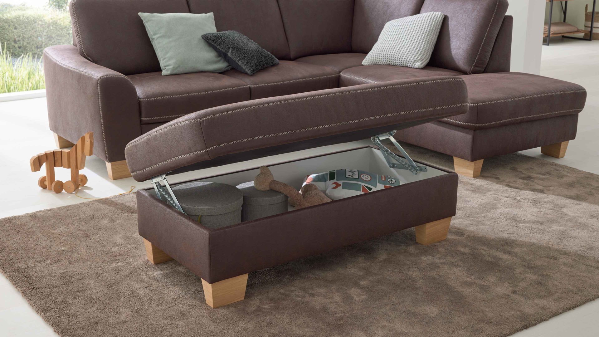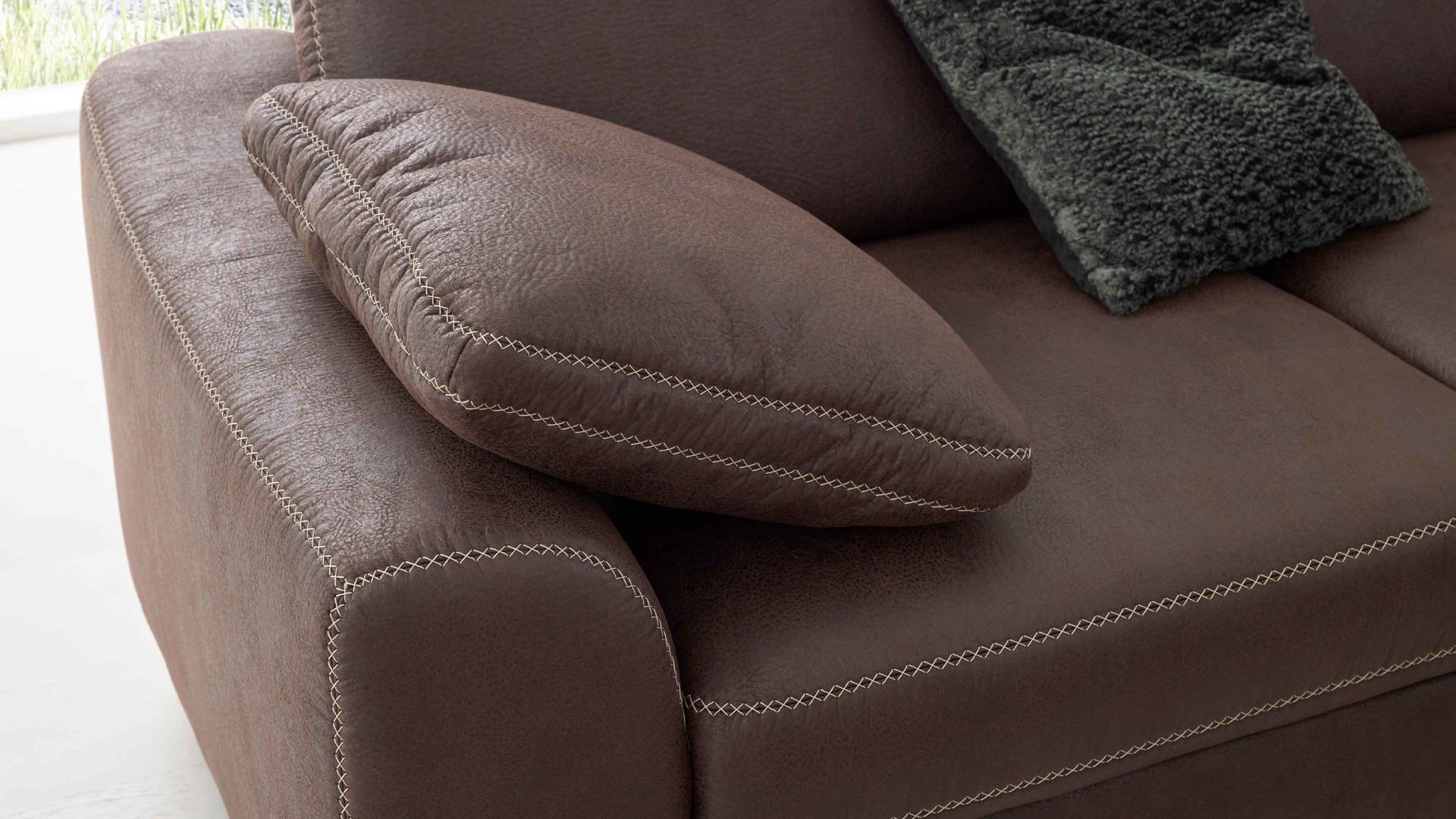 Zu den Highlights des Polsterprogramms gehören die grundsätzlich im Originalstoff bezogenen Rückseiten. Die Serie ist Made in Europe und mit dem Goldenen M ausgezeichnet.