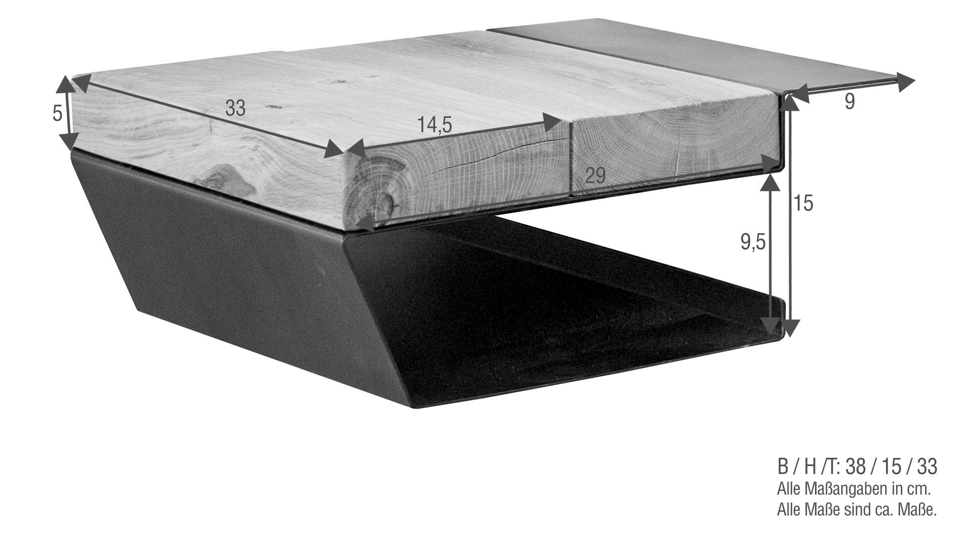 Hergestellt aus massiver geölter Wildeiche und schwarzem Metall, verleiht diese Konsole Ihrem Schlafzimmer einen modernen und stilvollen Look. Mit einer Größe von ca. 39 x 15 x 33 cm (BxHxT) bietet die Bettkonsole ausreichend Platz für Ihre persönlichen Gegenstände. Die praktische Metallablage ermöglicht es Ihnen, Bücher, Zeitschriften oder andere Dinge griffbereit zu halten.