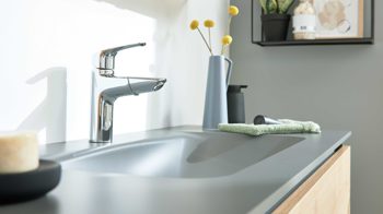 Ein optisches Highlight ist der schiefergraue Duratek® Waschtisch (Typ 87724). Das innovative Vollacryl-Verbundmaterial vereint Quarz, keramische Nanopartikel und moderne Acrylharze zu einer ultrakompakten, seidig-matten Oberfläche. Sie ist besonders pflegeleicht, kratz- und stoßfest, farbstabil und vermittelt ein edles, samtiges Gefühl. Maße: ca. 121 x 12 x 49 cm (B/LxHxT), mit Hahnlochbohrung, ohne Überlauf.