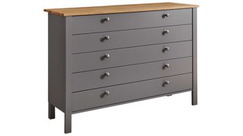 Die Maße der Schubkastenkommode betragen ca. 134,1 x 94,5 x 47 cm, wobei die Schubladenbreite ca. 120 cm beträgt. Dieses Möbelstück passt perfekt zu den anderen Produkten aus der Charleston Serie.