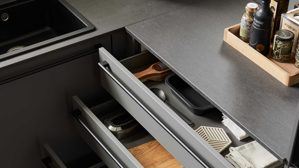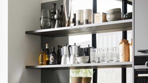 Die Einbauküche überzeugt durch ihre durchdachte U-Form mit extra dünnen, robusten XTRA CERAMIC Arbeitsplatten, die eine großzügige Arbeitsfläche und viel Stauraum bieten. Eine matt magmafarbene Einbauspüle wird zum dezenten Highlight, während offene Regalböden mit verspiegelter Rückwandverkleidung das Licht reflektieren und dem Raum Tiefe verleihen. So entsteht eine moderne, offene Küchenatmosphäre, die sowohl funktional als auch wohnlich ist.