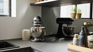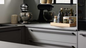 Die verspiegelte Nischenverkleidung lässt den Raum größer und heller wirken, während die großzügigen Arbeitsflächen dir beim Zubereiten und Servieren jede Menge Komfort bieten. Die hochwertige SCHOCK Einbauspüle in Magmafarbe fügt sich harmonisch ins Design ein und setzt einen stilvollen, modernen Akzent.