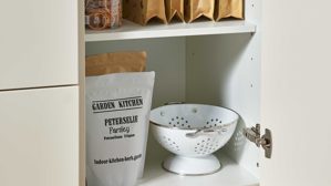 Die Culineo® Einbauküche C187 vereint warmes, wohnliches Design mit funktionaler Ausstattung und hochwertigen Materialien. Magnolienfarbener Mattlack, kombiniert mit Eiche Como Nachbildung und goldfarbenen Bügelgriffen, sorgt für eine harmonische, elegante Optik. Matte magnolienfarbene Korpusse, Regalböden und Sockelblenden unterstreichen den modernen Charakter, während grifflosen Fronten in Eiche Como Nachbildung das klare Design abrunden.