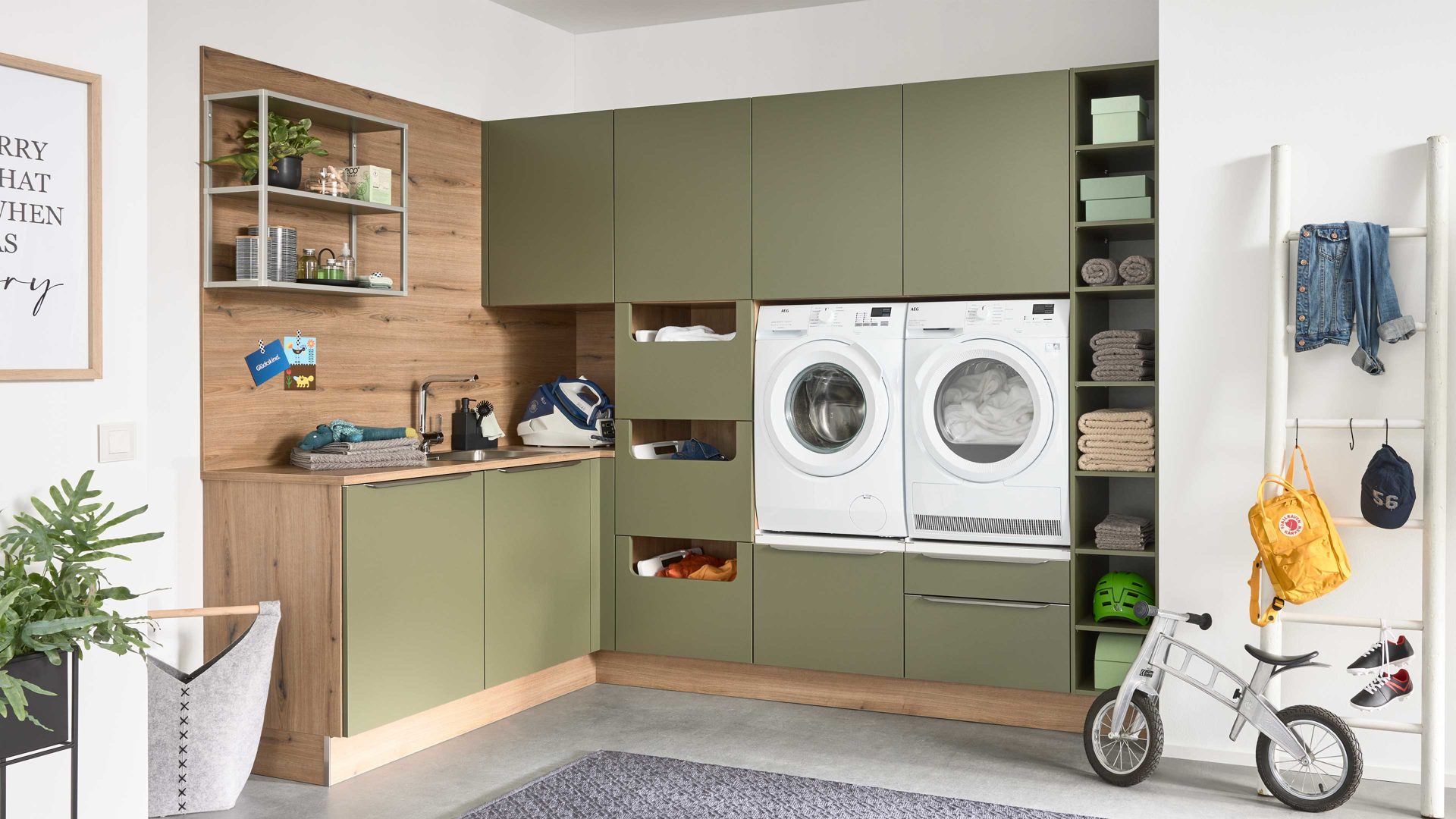 Mit einer Stellfläche bzw. einem Schenkelmaß von ca. 328 x 187 cm (B/LxT, von links nach rechts) bietet dieser Raum viele Möglichkeiten für clevere Aufbewahrung. In den Hochschränken kannst du sowohl Vorräte als auch eine Waschmaschine oder einen Trockner unterbringen. Dazu kommen ein Schubladenschrank, weitere Unterschränke und Hängeschränke sowie eine große Arbeitsfläche, die dir viel Platz für Wäschepflege oder die Organisation des Alltags gibt. Praktisch und hochwertig ist außerdem das integrierte runde Edelstahlbecken.