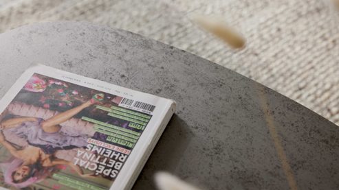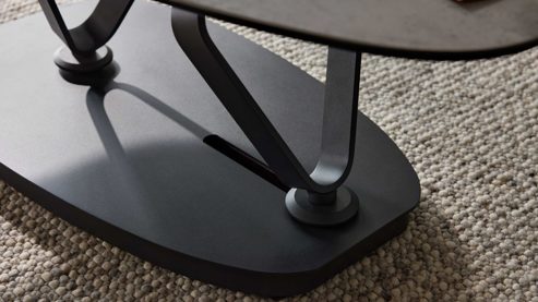Die obere, größere Tischplatte ist um 180° drehbar. Beim Drehen schiebt sich die untere, kleinere Platte in einer integrierten Schiene in der Bodenplatte elegant zur Seite. So vergrößert sich die Ablagefläche im Handumdrehen – ideal für Gäste, Snacks oder entspannte Abende auf dem Sofa.
